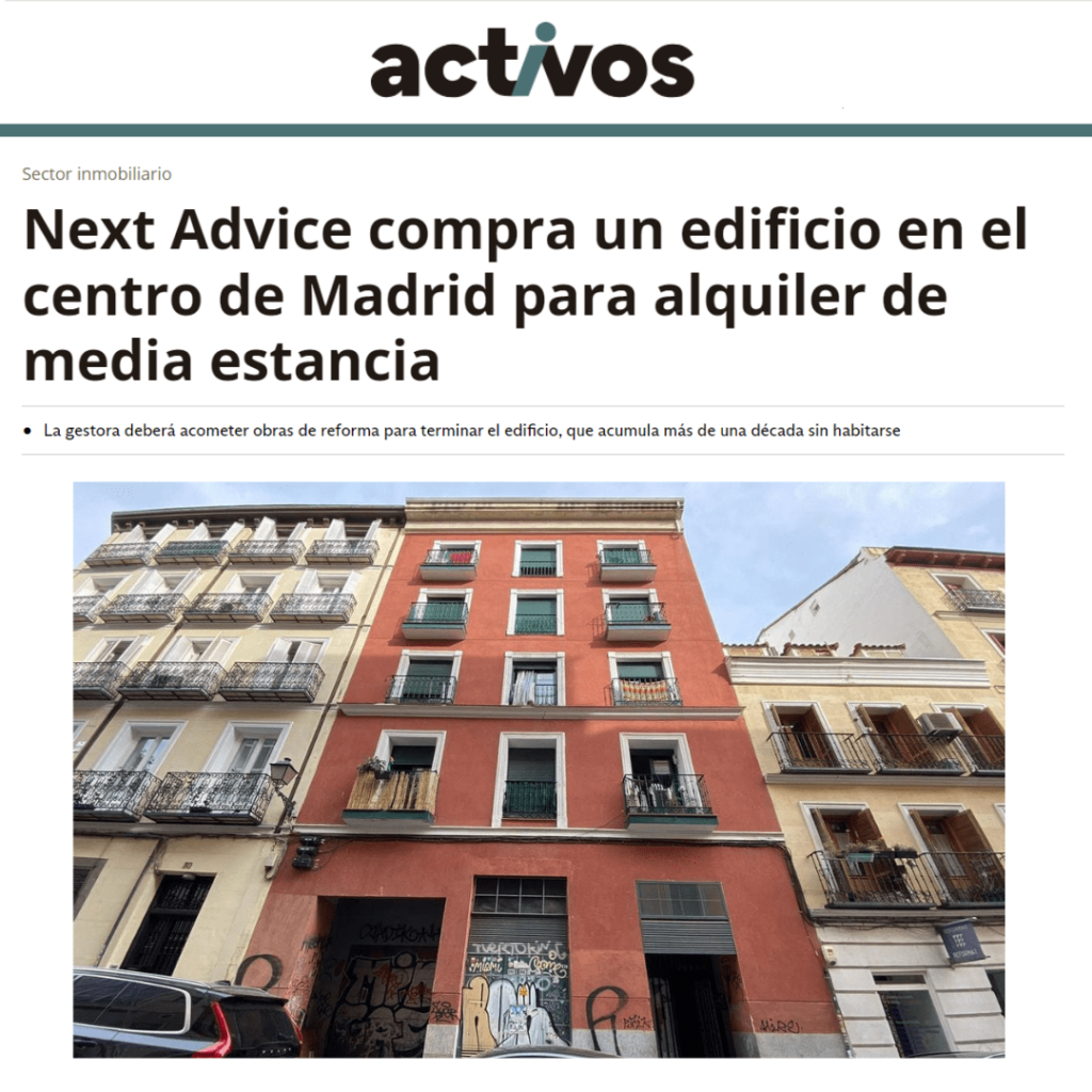 Next Advice ha adquirido un edificio en la calle Monteleón, pleno centro de Madrid. Este inmueble, con 14 apartamentos, será reformado para alquileres de media estancia, dirigido a estudiantes universitarios. La inversión supera los cinco millones de euros, incluyendo compra y reformas. El edificio, ubicado en el barrio de Malasaña, tiene una superficie de 840 metros cuadrados residenciales y contará con un aparcamiento robotizado de 44 plazas. Originalmente propiedad de Promociones La Fuente de Parla S.L., pasó a manos de Sareb y fue subastado en 2022. La finalización de la compra por Next Advice se espera para septiembre de 2024. La renovación del edificio proporcionará alojamientos modernos y accesibles, mejorando la oferta inmobiliaria de Malasaña. Next Advice, parte de Grupo Next junto a Next Abogados, se especializa en la adquisición y promoción de activos urbanos, destacándose por su compromiso con la calidad y el desarrollo sostenible. Pulsa aquí para leer el artículo en El Periódico de España. Descubre más noticias en nuestra sección de Actualidad Jurídica.